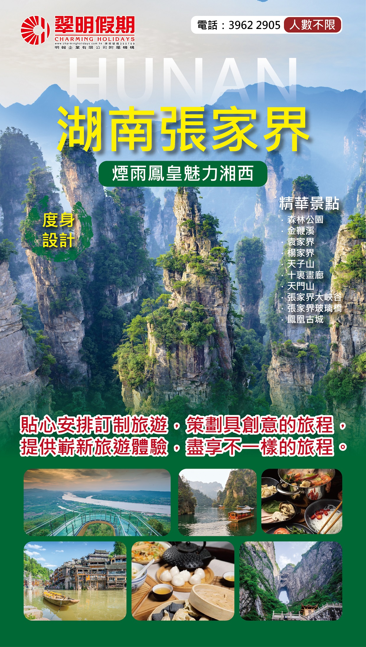 位於中國湖南省,是一個充滿自然美景和獨特地貌的旅遊勝地。這個地區以其壯觀的石柱峰林、清澈的溪流和幽靜的峽谷而聞名。張家界國家森林公園是最著名的景點之一,擁有令人驚嘆的自然景觀,如袁家界、黃龍洞和天門山。可以乘坐玻璃懸崖步道,俯瞰峽谷和峰峰相連的美景。此外,還可以參觀天子山和凈慈寺,感受宗教氛圍和文化遺產。湘西土家族苗族自治州也是一個值得探索的地區,擁有獨特的民俗文化和風景名勝,如鳳凰古城和吉首古城。在張家界,你還可以品嚐到當地的辣味美食,如辣椒炒肉和湘西腊肉。張家界結合了壯麗的自然景觀、深厚的文化底蘊和美味的美食,是一個令人難以忘懷的旅遊目的地。