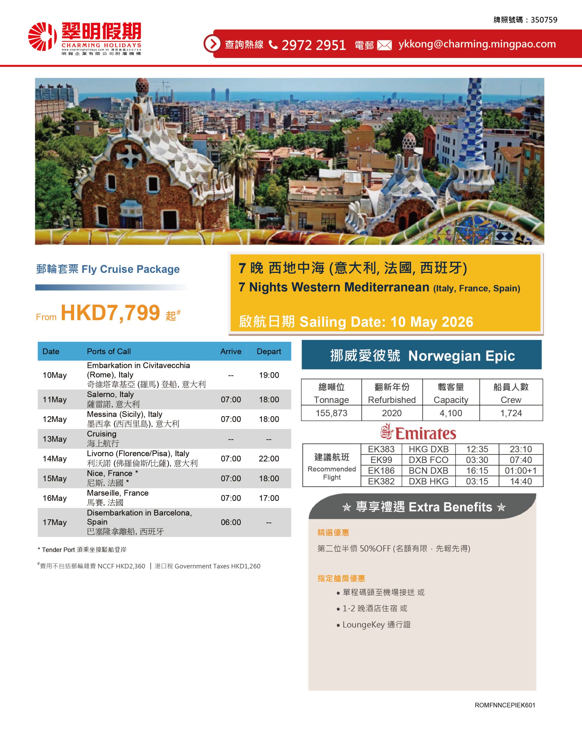 挪威愛彼號 – 7 晚 西地中海 (意大利, 法國, 西班牙)
