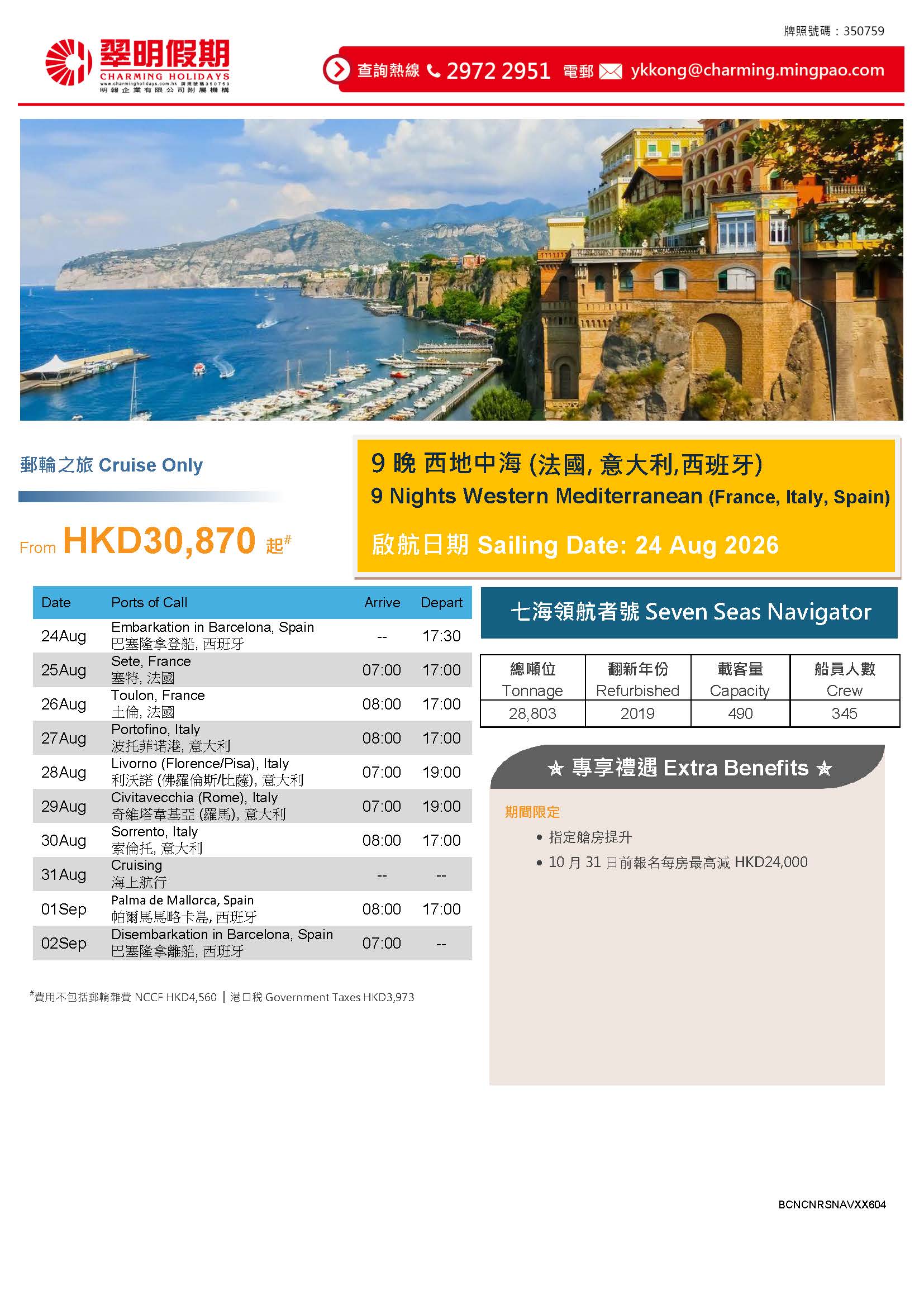 七海領航者號 – 9晚西地中海 (法國、意大利、西班牙)