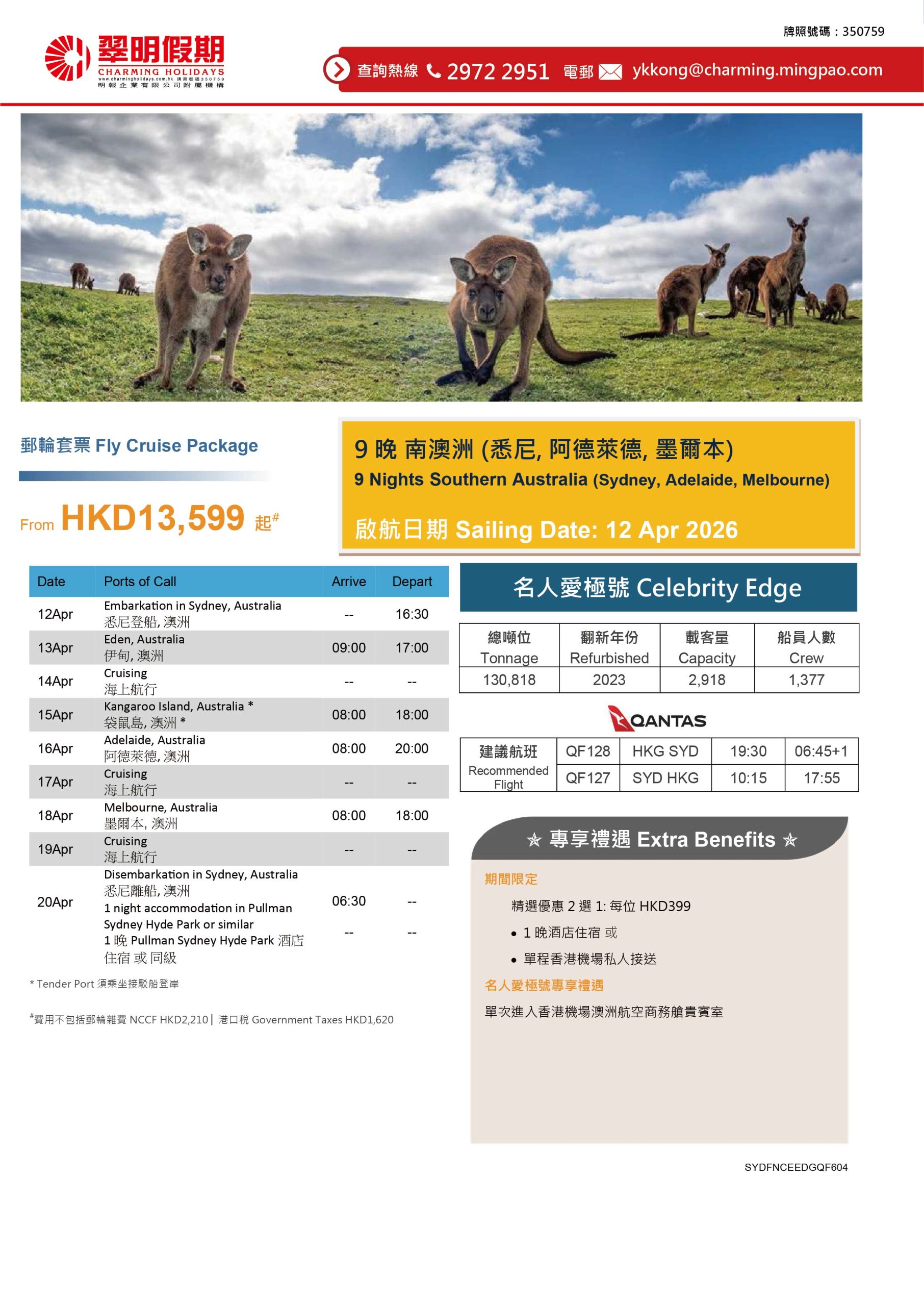 名人愛極號 – 9 晚南澳洲 (悉尼, 阿德萊德, 墨爾本)郵輪套票