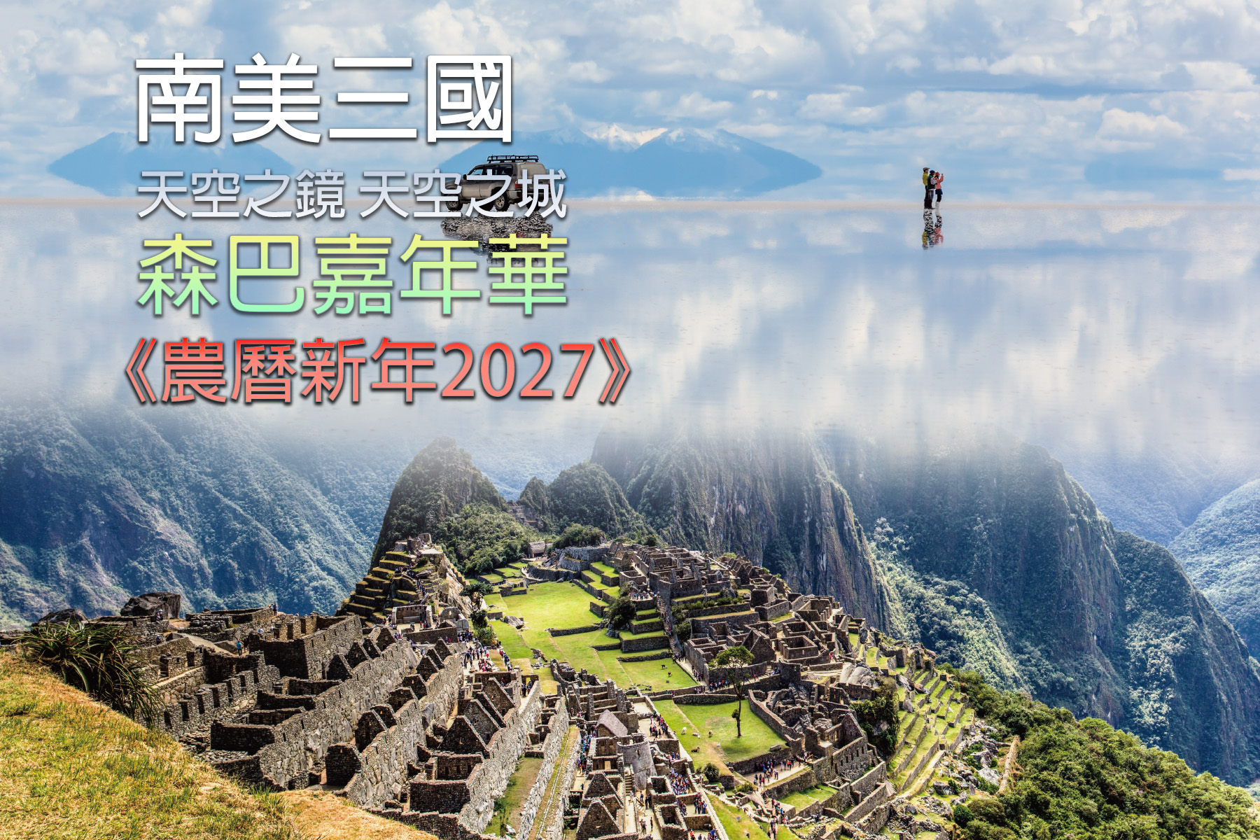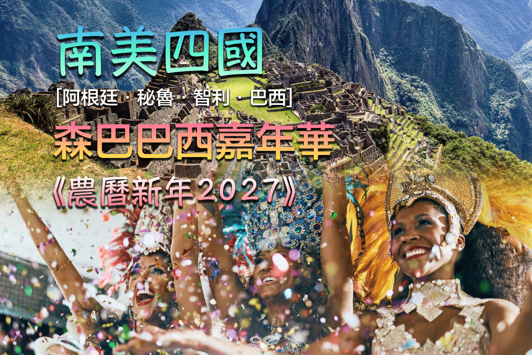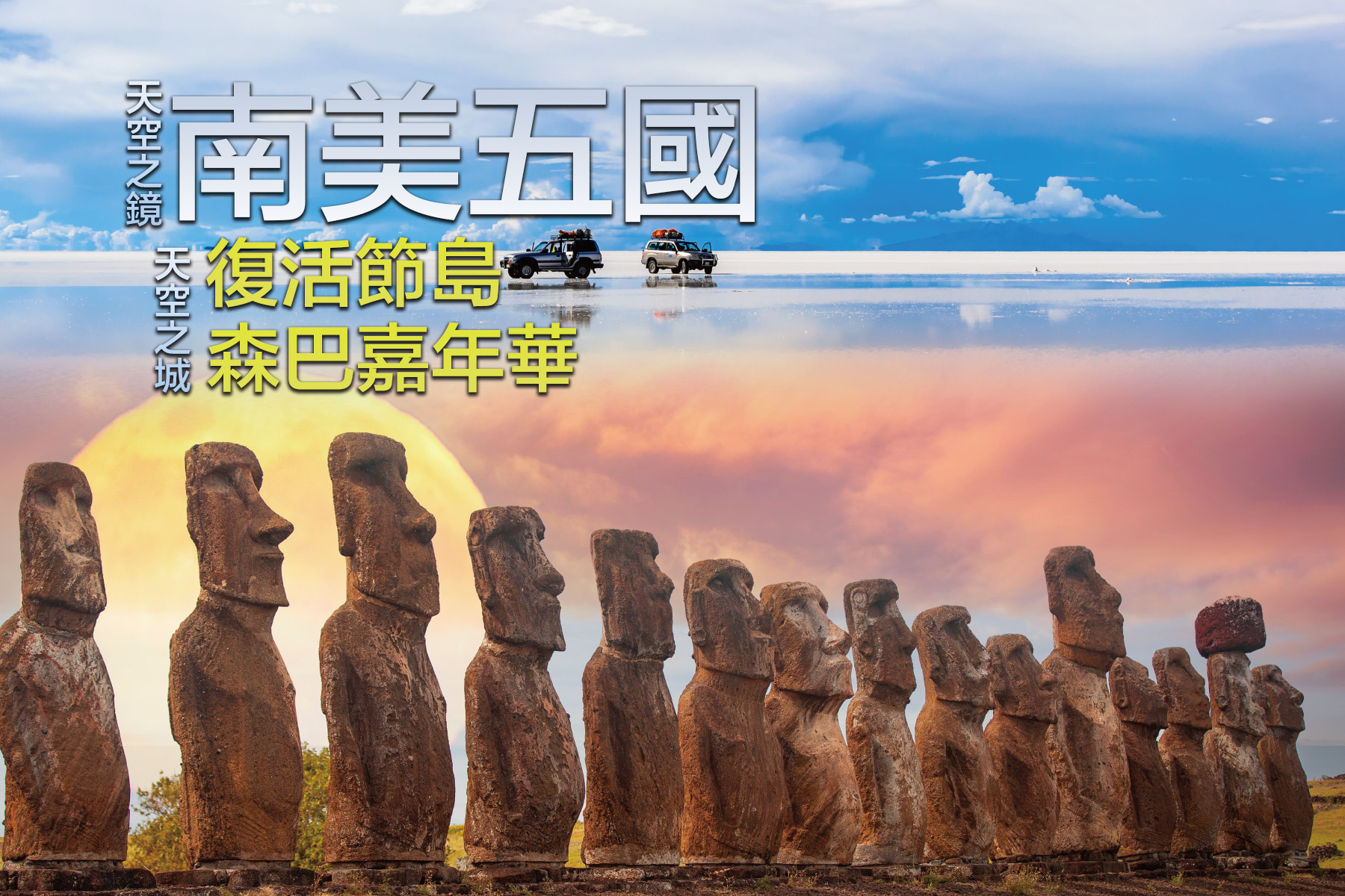阿根廷 ~ 布宜諾斯艾利斯.巴西 ~伊瓜蘇大瀑布、里約熱內盧、 【勝利者巡遊】森巴嘉年華、聖保羅.秘魯 ~利瑪、納斯卡神秘線條、亞馬遜雨林、 庫斯科、琴切羅、烏魯班巴、【天空之城】馬丘比丘.玻利維亞~拉巴斯、【天空之鏡】 烏尤尼鹽湖.智利 ~ 聖地牙哥、復活節島、卡薩布蘭卡山山谷