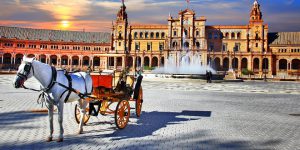 【西班牙廣場】馬利亞路易莎公園內之西班牙廣場,是 1929 年博覽會所在地。廣場內的歷史故事瓷畫,色彩生動,孤形拱牆上,精雕細琢的磁片貼飾成各省徽章和歷史故事。