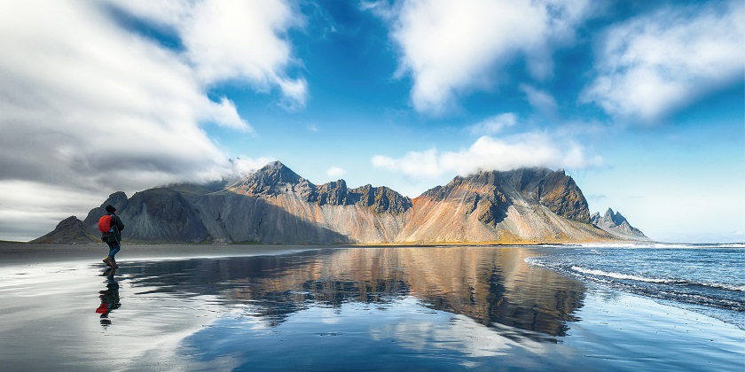 【蝙蝠山】位於冰島東南岸Vestrahorn山,是一個454米高的卵石山,主要由輝長岩(Gabbro)和花崗岩(Granophyre)組成,因為其造型被稱為「蝙蝠山」。視乎天氣情況,有機會在前方的海灘拍出山和景物的倒影又被稱為「冰島的天空之鏡」。優美的山形、獨特的環境,看到日落後色溫變化所形成的Vestrahorn山「藍調」美景,是最難忘的回憶之一。它和斯奈山半島上的教堂山Kirkjufell並列、是冰島被拍攝最多次的山峰,也是攝影師的最愛。