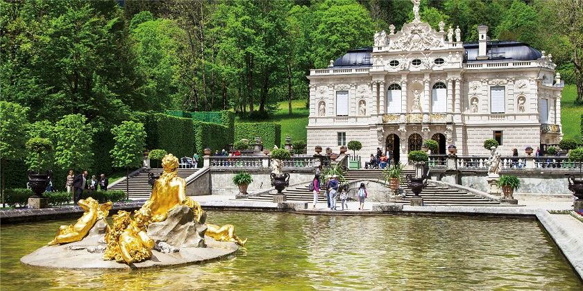 【林德霍夫宮】位於僻靜優美的格拉斯旺山谷,走訪路德維希二世的國王別墅及花園,巴洛克式花園內的噴泉傾寫而下,景色迷人,每年都吸引無數遊客。