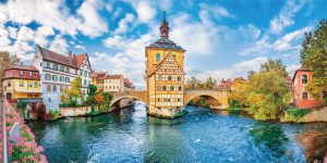 【班貝格】德國少有的迷人水鄉,動人景緻,舊城滿佈漂亮的紅瓦頂建築,連第二次世界大戰時盟軍也不忍心炮轟攻擊,現時已被聯合國列為世界文化遺產。遊覽班貝格市內名勝,該處建於河上的舊市政廳,兩旁畫滿彩色壁畫及壯麗的大教堂等,瀰漫昔日輝煌氣派。