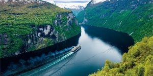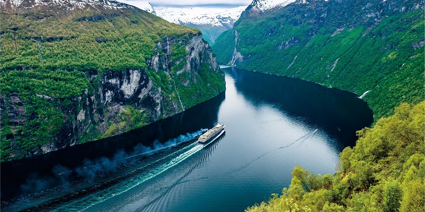 【挪威蓋倫格峽灣】乘觀光船暢遊蓋倫格峽灣(漫遊海勃爾特及哥義郎格區域之風光路段)。峽灣於百多萬年前由於地球氣溫改變,冰覆地帶冰川融化而形成,由於峽灣偏狹的關係,「七姐妹」及「新娘面紗」之風光路段,更享譽世界。