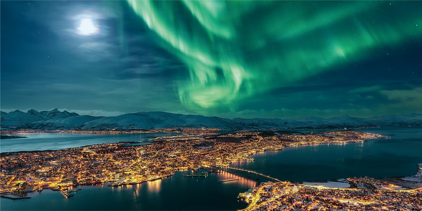 【特羅姆瑟】挪威北部最大的城市,位於高緯度北緯 69.4 度,有利觀賞極光,成為近年觀賞極光的熱點。因受北大西洋暖流影響,特羅姆瑟的氣候與其他同處一個緯度的極光地區相比,更為宜人。