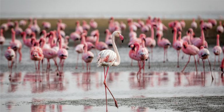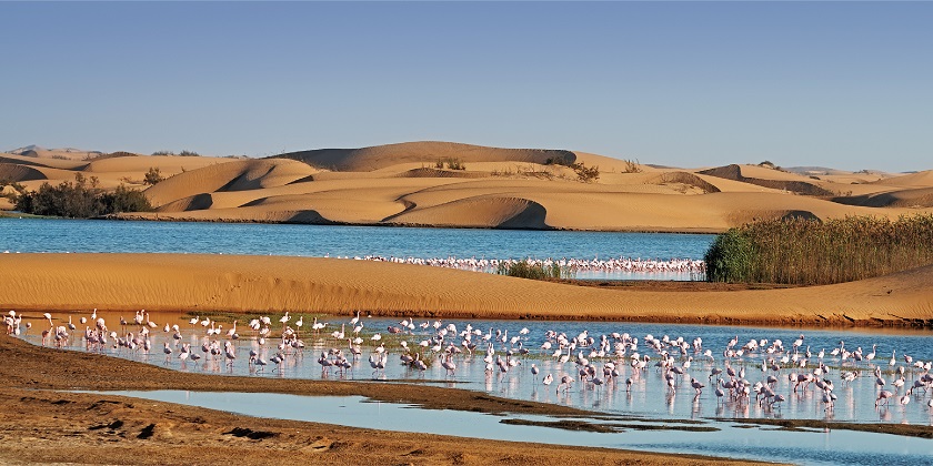 【鯨港灣-海上暢遊)】鯨港灣的淺湖區追踪紅鶴,此區為非洲大陸的主要濕地,大量禽鳥棲息於此。特別安排乘坐遊艇暢遊海灣區,欣賞各類禽鳥、海鳥,更有機會近距離接觸軟毛海豹,色彩斑斕的大塘鵝。遊艇亦會航行到海豹島沿岸,除拍攝海豹生態外,更可追踪海豚、海龜等海洋生物。由於鯨港灣水域浮游生物豐富及無工業污染的優良條件下,成為養殖生蠔的最佳位置。船上享用生蠔、葡萄氣酒及小吃。