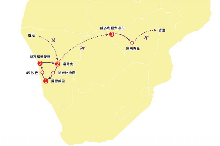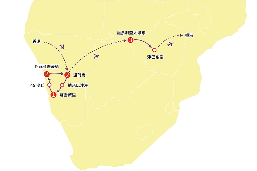 是日晚上於香港國際機場集合,由翠明假期領隊陪同下,乘坐埃塞俄比亞航空公司客機經阿的斯阿貝巴轉機後飛往納米比亞首都~溫荷克。