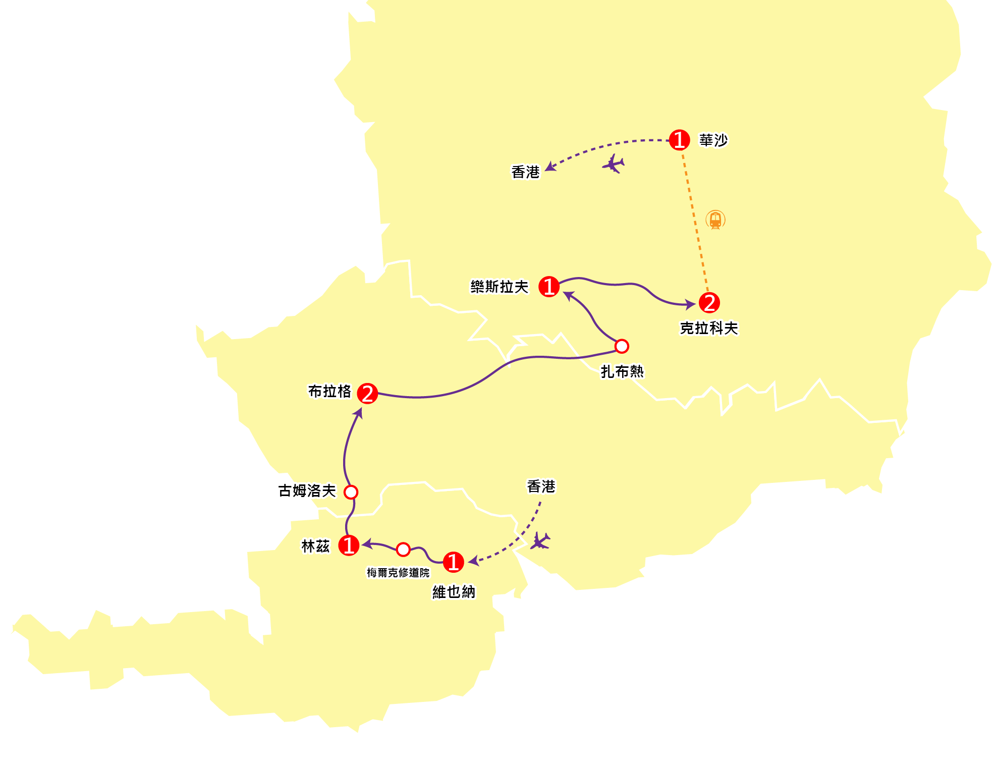 注意:如乘坐阿聯酋航空公司,將於出發日期第一天晚上集合及於第二天凌晨航班起飛經杜拜轉機後飛往維也納。