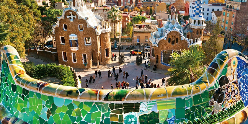 【桂爾公園】公園內如蛋糕般的小屋、希臘式的廊柱,高迪將鮮豔色彩馬賽克拼貼和活潑不規則的線條設計,就像踏進童話世界裡。