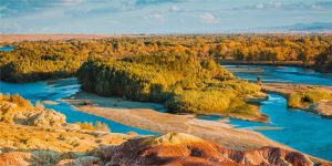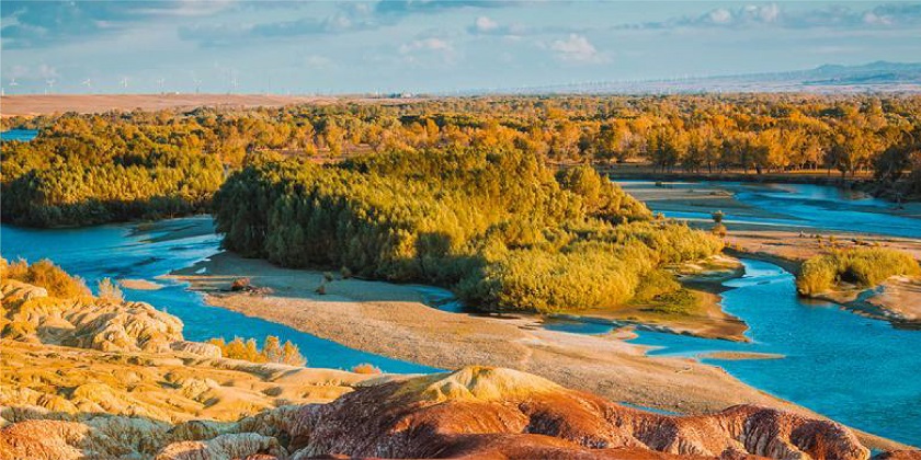五彩灘:一河兩岸南北各異,由激猛的額爾齊斯河沖冼切割及狂風侵蝕雕刻河岸而形成的地質奇觀。