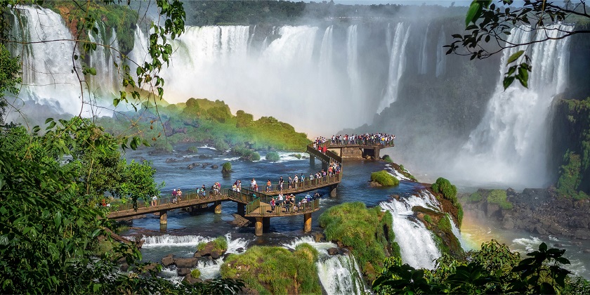 【伊瓜蘇大瀑布】伊瓜蘇大瀑布實為一組瀑布群,橫跨阿根廷和巴西,由二百七十五條大小瀑布或急流組成,總寬度2.7公里,比尼加拉瀑布寬4倍,是世界上最寬的瀑布。瀑布群雷鳴般的水流,冲擊聲浪可以傳到廿五公里以外的地方,巨浪掀起的水霧高達一百五十米,水霧在陽光的照射下,演化成七彩繽紛的,形狀各異的彩虹。伊瓜蘇大瀑布的壯美景觀被譽為南美洲的一大奇觀。