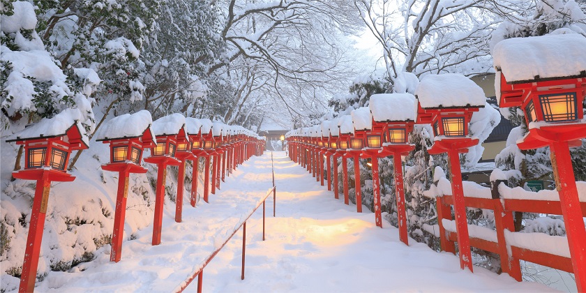 【冬日貴船神社】主祀龍神,是京都三大龍神之一,也是許多人尋求財運和事業成功的聖地。神社的建築保留了傳統日式風格,屋頂和牆面充滿古樸韻味。冬天下雪後的神社被銀白色的冰雪世界所包圍,白雪中的紅色鳥居、石階、燈籠等各種建築物更顯奇幻而雄偉。