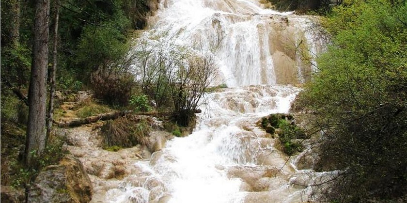 牟尼溝紮嘎瀑布:紮嘎,藏語意為白巖上的激流。紮嘎瀑布是牟尼溝風景區兩大景觀之一。瀑布上遊是湖泊,下遊是階梯式河床,湖水從巨大的鈣化梯坎上飛速寫速跌落,經三級鈣華臺階跌宕而下,沖擊於巨大的鈣華石壁,形成巨幅瀑身,聲聞十里,如戰鼓擂動,如萬馬奔騰。