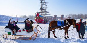 伏爾加莊園(包馬拉扒犁):雪後的莊園銀裝素裏,一幢幢風格各異、色彩豔麗的俄式建築在白雪的點綴下分外嫵媚,宛如置身於歐洲小鎮。
