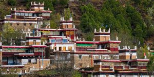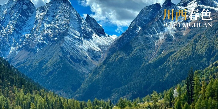 甲居藏寨(含觀光車)觀景臺,遠眺嘉絨藏族民居:“甲居”,藏語是百戶人家之意。藏寨從大金河谷層層向上攀緣,一直伸延到卡帕瑪群峰腳下,整個山寨依著起伏的山勢迤避連綿,在相對高差近干米的山坡上,一幢幢藏式樓房灑落在綠樹叢中。