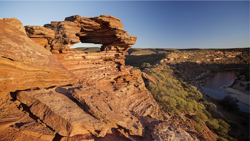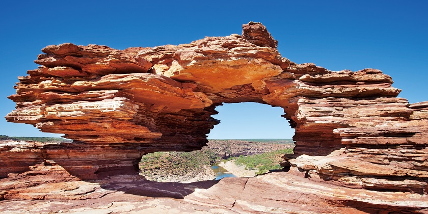【卡爾巴里國家公園】西澳最具代表性的自然景觀之一。迂迴曲折的巨大峽谷,高聳筆直的海岸峭壁,造就了國家公園內筆墨難以形容的壯麗。其中位於環形步道上,座落在懸崖邊的自然之窗,正是國家公園內著名的景觀。奇妙的破洞景色,是大岩石經由長時間風化的作用藝術,粗獷線條的岩石框框,宛若一扇窗戶,它框住蔚藍的天空。從公路到自然之窗的地點,須經過一段類似洗衫板硬條紋的黃土地,車子頗為抖動,敬請留意。其最新建成的天空步道,從莫爾其森河峽谷最高點向外懸掛超過25米,離地約100米,可欣賞整個峽谷的壯麗景色。