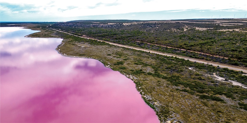 【赫特瀉湖~觀光飛機欣賞粉紅湖】呈現美麗的粉紅色,就像一個羞澀的新娘,該湖比一般的湖泊的鹹度要大,這主要是因為湖中藻類產生豐富的β-胡蘿蔔素(Beta Carotene),使湖水