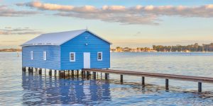【藍色船屋】位於天鵝河畔之上,原名為「Crawley Edge Boatshed」,本是一個船棚,已經有90年歷史,其間經歷多次整修,在2001年,因船棚過於破舊而面臨清拆危機,幸得時任珀斯市長帶領,與當時的擁有者將其翻修,並大膽地塗上鮮艷的藍色,才打造出今時今日的打卡勝地。