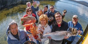 【塔斯曼尼亞海鮮盛宴之旅】乘坐特製遊船出海,從美麗的荷伯特港駛出,沿途可見巨岩景觀,更有機會看見海豚及海豹快閃出現,約一小時船程後抵達(Get Shucked)生蠔場,隨即品嚐即開新鮮生蠔。其後到達海中的三文魚場,觀看無數的三文魚在魚場內游動,船上則安排品嚐鮮味的三文魚刺身,配以地道Jansz Sparkling Wine。在您享受海鮮時,船長已跳入海裡搜羅海鮮。深海野生鮑魚、海膽,船員們以不同方式烹調青口、生蠔、岩龍蝦(Rock Lobster)及其他海鮮,行程中以塔斯曼尼亞不同美酒、芝士、麵包、水果等,佐以新鮮又豐富的海鮮大餐。用膳後,船員會向政府報告消耗了的鮑魚及海膽數量,合力透過限量捕獲來維持生態平衡,非常負責任。