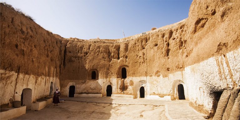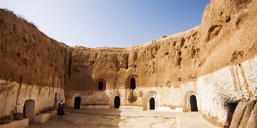 【馬特馬它】突國中部高原「柏柏爾」人的聚居地。這裡的人在山石中挖掘洞穴而居,洞穴不僅可以遮避酷熱的烈陽,還可以防止風沙的吹襲,四季都可維持舒適的常溫,冬暖夏涼。並安排柏柏爾人家訪 。