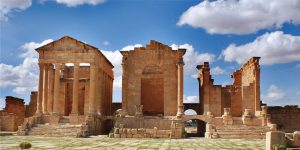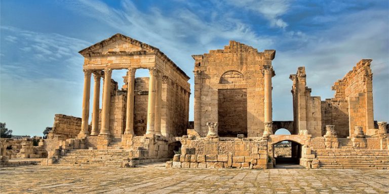 【杜加古城】建於西元前6世紀末,位於海拔600公尺小山丘上的杜加古城,古城居高臨下具有極佳的戰略位置。杜加古稱「Thugga」是石頭山的意思。古城遺址反映出當時羅馬帝國邊緣小鎮的風貌,如今尚存的半圓形的羅馬劇場、廣場、浴場、劇場、神殿、市民廣場、民宅、廁所等。保留最完整的就是Capitol神殿,神龕原本供奉著天神朱比特(Jupiter)、天后朱諾(Juno)及其女兒蜜妮娃(Minerva即雅典娜)。