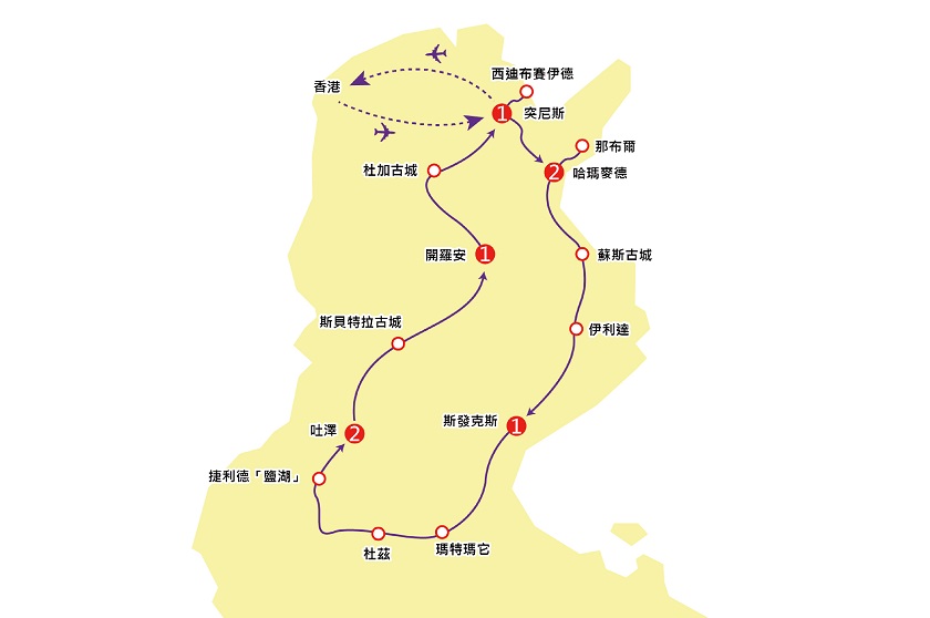 註︰如若選乘土耳其航空公司,於出發前一天晚上集合及出發,經伊斯坦堡轉機後飛往突尼西亞首都~突尼斯,於翌日抵達目的地,天數改為 10 天。