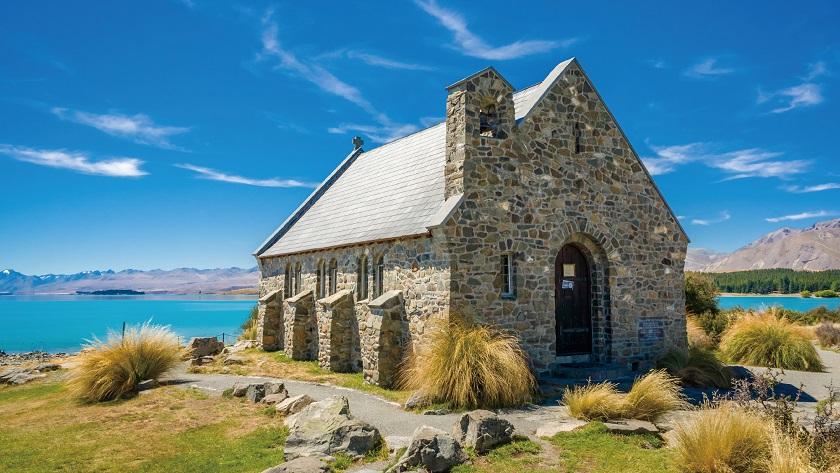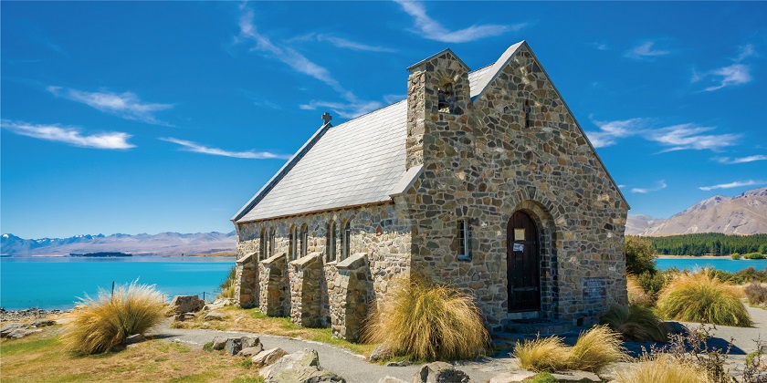 【迪加寶湖小教堂】這座漂亮的石教堂位於新西蘭的迪加寶湖岸邊,教堂以一隻牧羊犬的雕塑而命名,是對過去開創農田和當地的先驅者的一個稱頌。