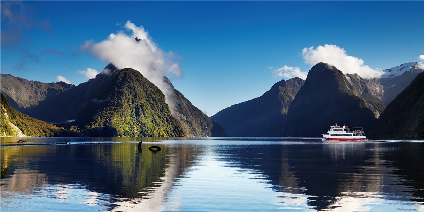 【米爾福德峽灣】此峽灣是由億萬年前冰河時期,經冰川運動侵蝕而遺留下來之奇景,沿途途經瀑布、山峰、雨林及峽谷等的景色。稍後乘遊船觀賞海豚生態,此峽灣內懸崖峭壁,奇川瀑布處處。