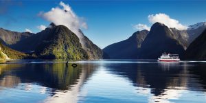 【米爾福德峽灣】此峽灣是由億萬年前冰河時期,經冰川運動侵蝕而遺留下來之奇景,沿途途經瀑布、山峰、雨林及峽谷等的景色。稍後乘遊船觀賞海豚生態,此峽灣內懸崖峭壁,奇川瀑布處處。