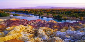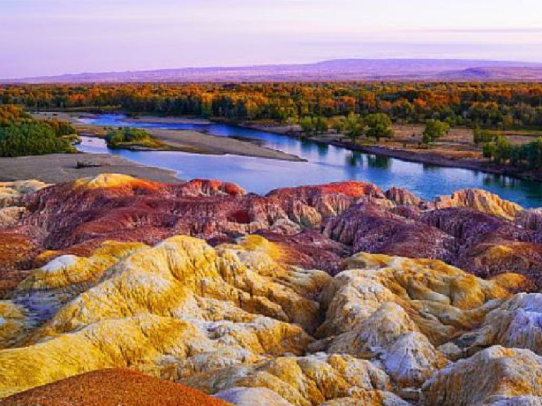 五彩灘:一河兩岸南北各異,是由激猛的額爾齊斯河沖冼切割以及狂風侵蝕雕刻河岸而形成的地質奇觀。