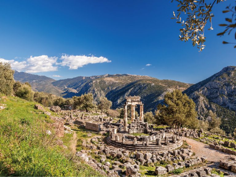 【德爾菲】希臘神話故事中,宙斯從世界的兩端各派出一隻老鷹來測量大地,兩隻相反飛行方向的老鷹終於在德爾菲相遇,從此這裡便成為世界的中心,被譽為「大地的肚臍」。德爾菲小鎮,路上都是民宿,販賣希臘眾神各類雕像的手工藝品店,以及餐廳與酒吧。著名的古代遺跡神廟坐立在這座山城之上,使這個小鎮更為閃爍耀眼。