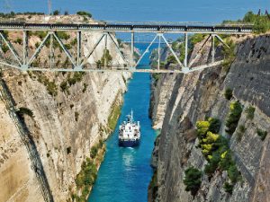 【柯林斯運河】壯麗奇觀的運河,長6300米,深8米,僅寬24米,1893年由法國民間企業利用天然地峽開鑿岩壁興建而成。運河將伯羅奔尼撒半島和希臘大陸分割開,成為往來愛琴海和愛奧尼亞海之間最短的捷徑。
