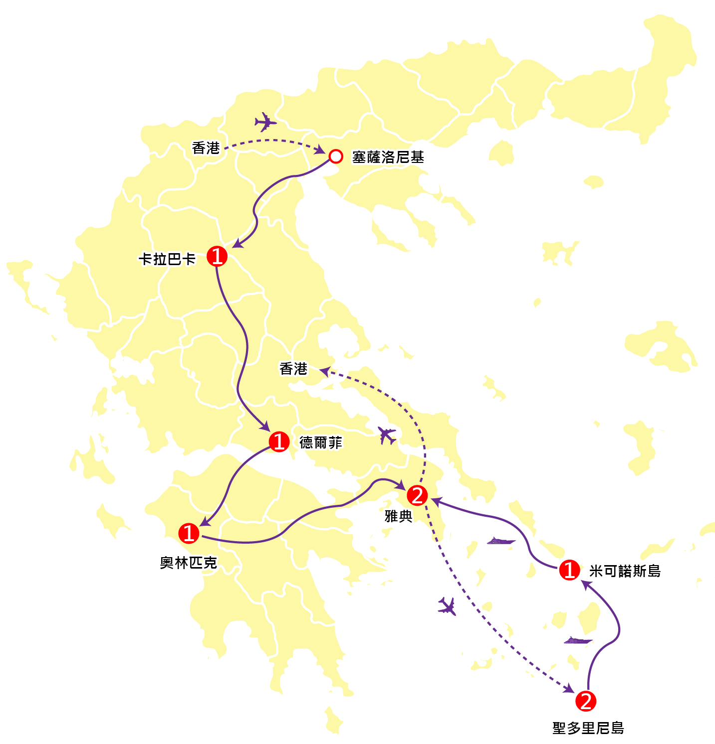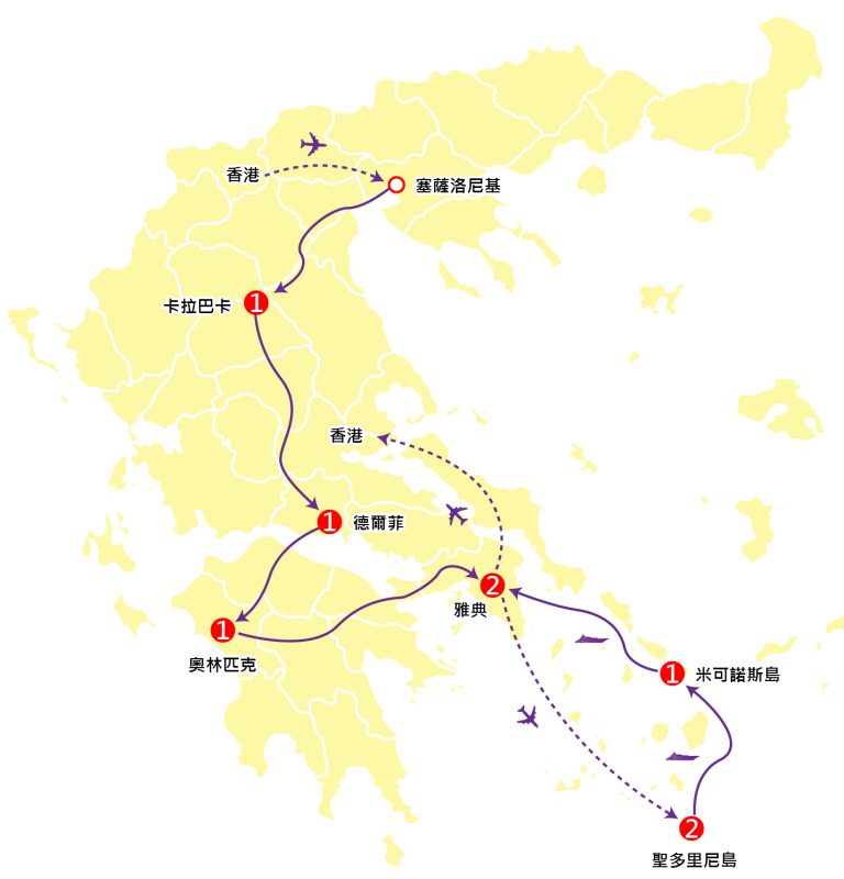 注意:由於由雅典往聖多里尼島之內陸航機,每位乘客寄艙行李一件 20Kg 及手提行李一件 8Kg,故本社建議客人携帶輕便行李前往聖多里尼島及米可諾斯島,大件行李可暫存雅典酒店托管。航班時間以旅團集合資料為準。