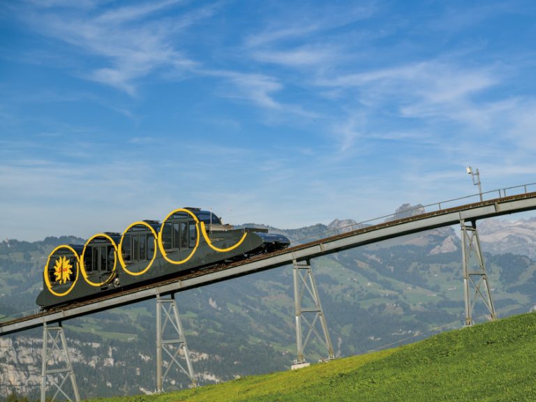 【施圖斯纜車】耗資5.2百萬瑞士法郎打造,是全球最陡(47.7度)的纜車鐵路。其獨特車廂由四節滾筒式組件構成,於陡坡爬升時仍能自動保持水平,確保乘客以最佳角度欣賞沿途壯麗山景。
