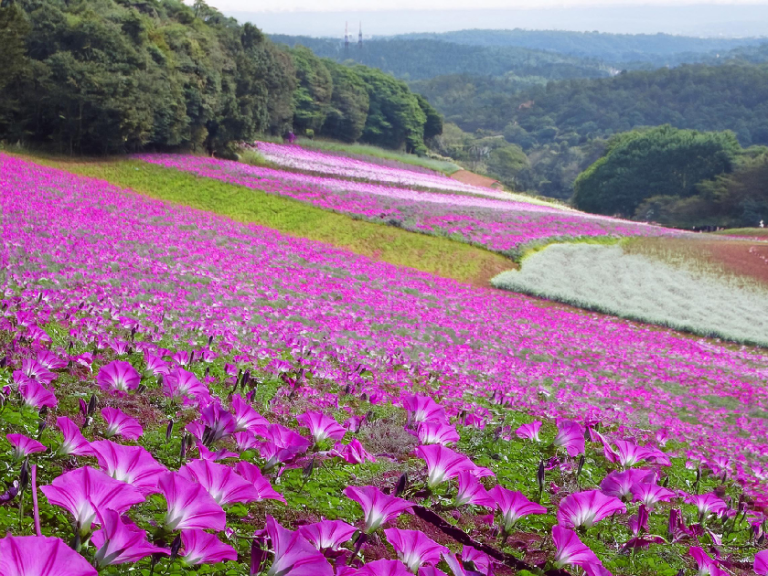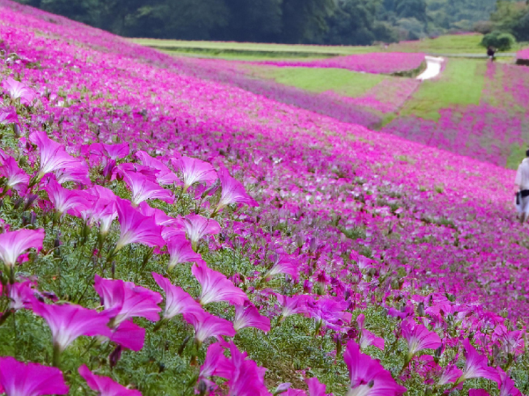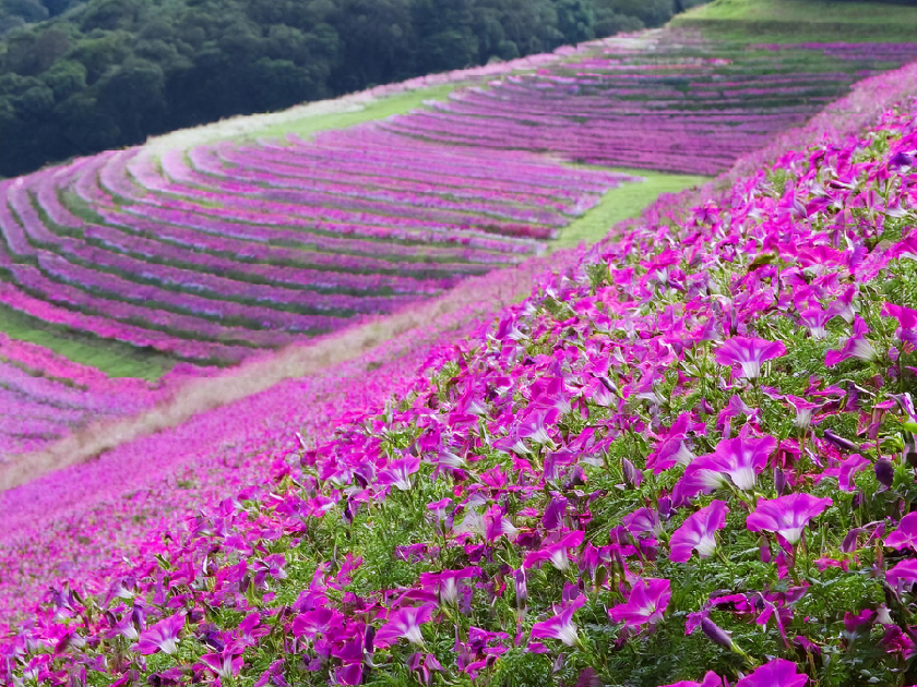 【母親牧場】賞牽牛花:夏季在母親牧場盛開的「桃色氣息」是矮牽牛的改良品種。這個品種是由南房總出身的園藝家杉井明美和千葉大學共同開發的,誕生於千葉縣。從7月到9月,約有20,000株花將母親牧場內「花之谷」的斜面染上鮮豔的粉色。一片染成桃色的花田美得讓人嘆息。請一邊欣賞大規模的花田、夏天的藍天和房總的山脈,一邊度過特別的時間。