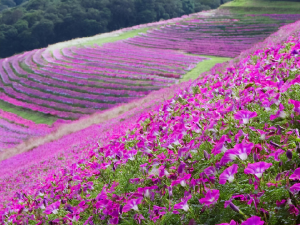 桃色氣息(矮牽牛)為了防止夜間和下雨天花損壞,自己關上花瓣保護自己不受夜露和雨水的侵害。即使是晴天,像梅雨一樣持續下雨後,也不能看到鮮豔的粉色花田了,雨停後充分沐浴在陽光下,又開花,用鮮豔的顏色裝點一片。