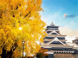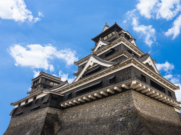 【熊本城】是一座位於九州熊本縣熊本市中央區的山頂日式城堡,佔地廣大且防守極為嚴密。城堡的高塔(天守閣)為一座建於 1960 年的混凝土重建建築物,但原城堡的數棟附屬木造建築物則維持原樣。熊本城與姬路城、松本城並列為日本三大名城,其建築群中有十三座結構已被指定為重要文化財產。