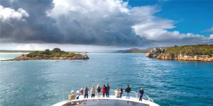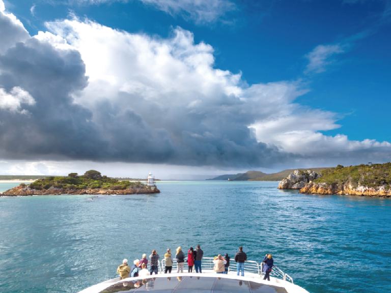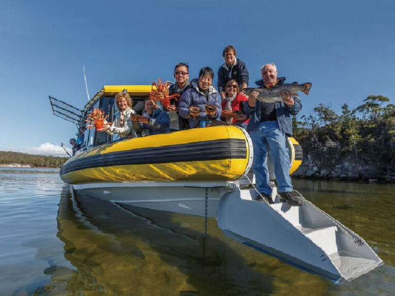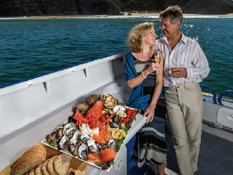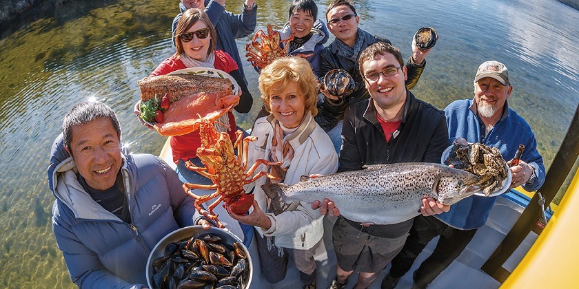 【塔斯馬尼亞海鮮盛宴之旅】乘坐特製遊船出海,從美麗的荷伯特港駛出,沿途可見巨岩景觀,更有機會看見海豚及海豹快閃出現,約一小時船程後抵達(Get Shucked)生蠔場,隨即品嘗即開新鮮生蠔。其後到達海中的三文魚場,觀看無數的三文魚在魚場內游動,船上則安排品嘗鮮味的三文魚刺身,配以地道Jansz Sparkling Wine。在您享受海鮮時,船長已跳入海裡搜羅海鮮。深海野生鮑魚、海膽,船員們以不同方式烹調青口、生蠔、岩龍蝦(Rock Lobster)及其他海鮮,行程中以塔斯曼尼亞不同美酒、芝士、麵包、水果等,佐以新鮮又豐富的海鮮大餐。用膳後,船員會向政府報告消耗了的鮑魚及海膽數量,合力透過限量捕獲來維持生態平衡,非常負責任。