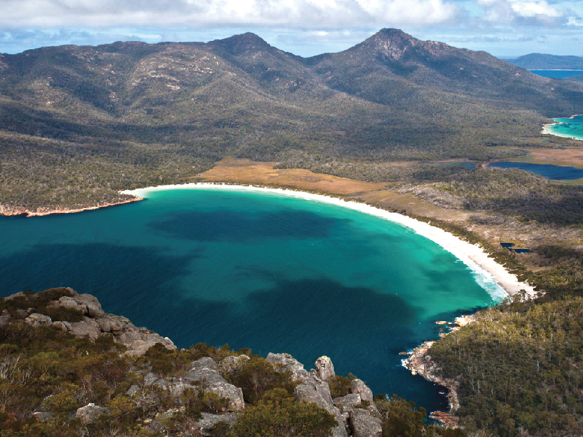 【菲瑟湼國家公園、酒杯灣】位於塔斯曼尼東海岸,自然風光優美瑰麗,登上半島高處,健行步道活動至最佳位置,可俯瞰及獵影半月型藍色的酒杯灣,令人心醉。酒杯灣是塔斯曼尼亞島上最受遊客和當地人歡迎的度假勝地。美國雜誌《Outside》將酒杯灣評定為全球十大海灘。