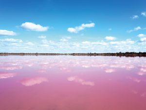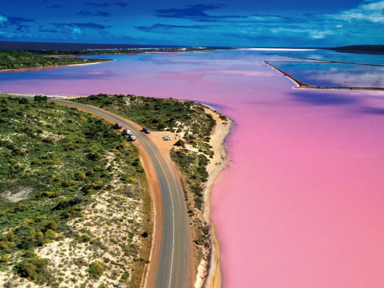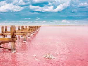 呈現美麗的粉紅色,該湖比一般的湖泊鹹度更高,這主要是因為湖中藻類產生豐富的β-胡蘿蔔素(Beta Carotene),使湖水鹽度增加,並呈現出明亮的粉紅色澤,猶如鑲嵌在大地上的彩色寶石般迷人奪目。