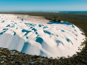 西澳著名的冒險勝地,擁有綿延80公里的純白沙丘帶,沙質細如粉末,隨風流動形成波紋狀的天然藝術。特別推薦體驗刺激的滑沙活動,從30米高的沙丘頂端俯衝而下。這裡更是印度洋日落的最佳觀測點,當夕陽將沙丘染成玫瑰金色時,與湛藍海水形成強烈對比。周邊海域時有海豚群出沒,沙丘後方的鹽湖群在雨季會吸引大量候鳥棲息。