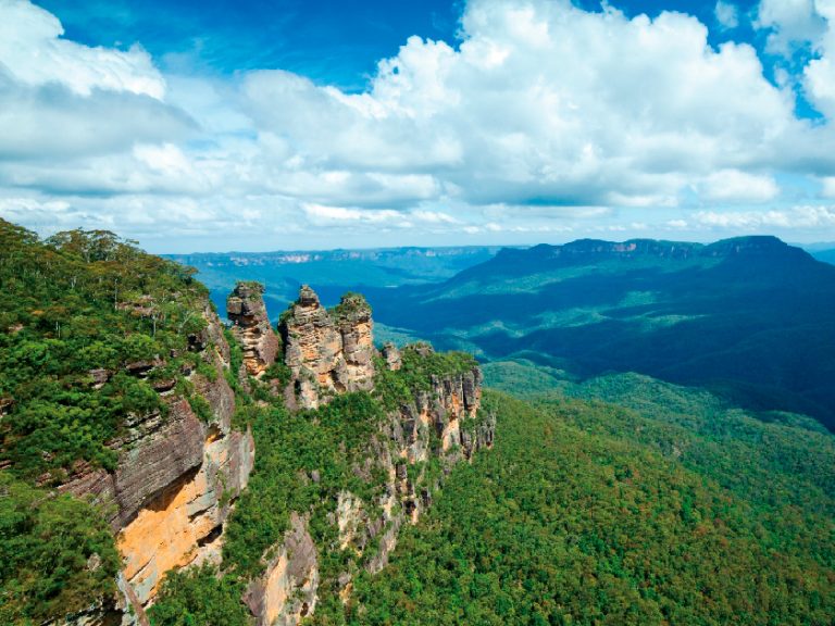 【藍山國家公園】佔地百萬公頃,因為山上生長了許多尤加利樹,樹葉釋放的氣體聚集在山間,形成一層藍色的薄霧,因此得名。公園內擁有壯麗迷人的景觀,包含高大森林、砂岩絕壁、峽谷、瀑布等豐富自然資源,也保有豐富的澳洲原住民文化資產,大藍山地區於 2000 年被聯合國教科文組織列入世界自然遺產名錄。公園內的三姐妹岩是大約2億年前的三疊紀砂岩,被風、雨和河流侵蝕而逐漸形成特殊的造型。