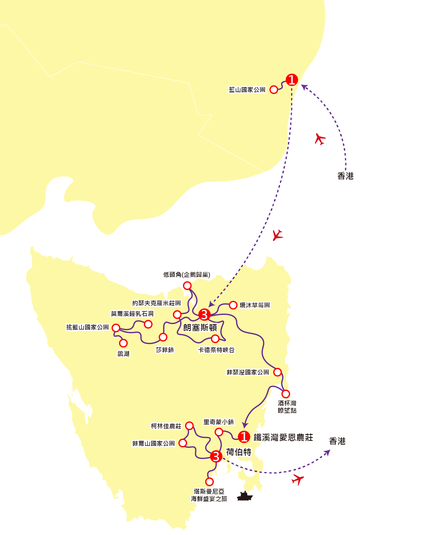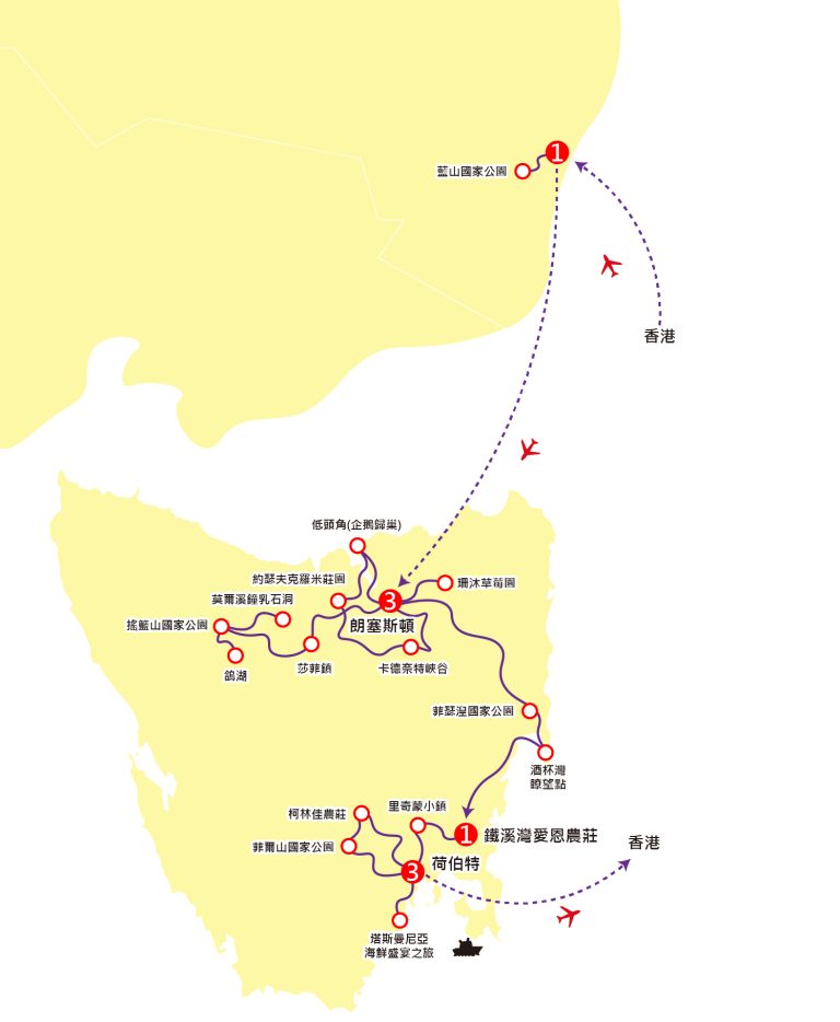 早上前往荷伯特機場,搭乘澳洲航空公司客機經悉尼或墨爾本飛返香港,航機於第10天下午抵達香港國際機場。
