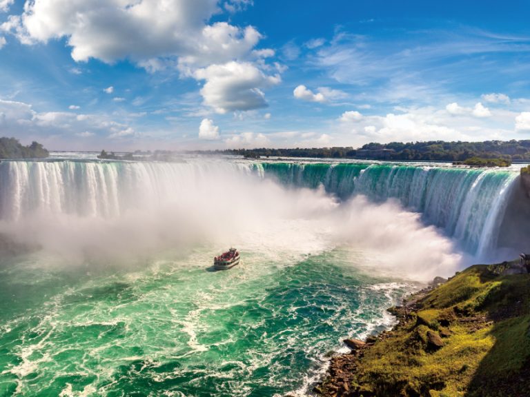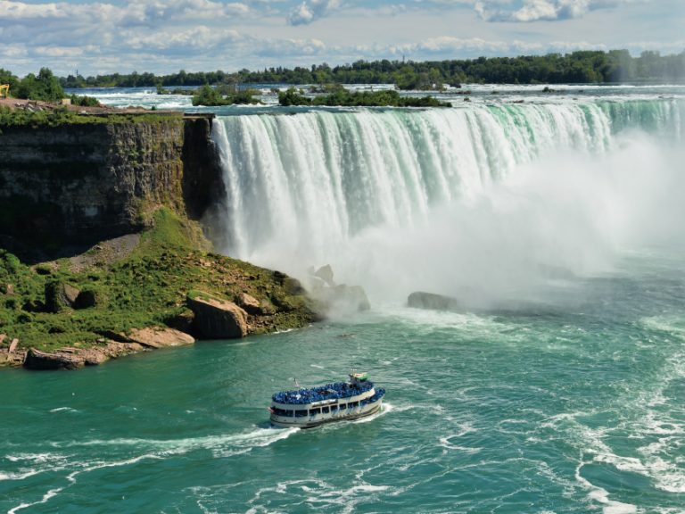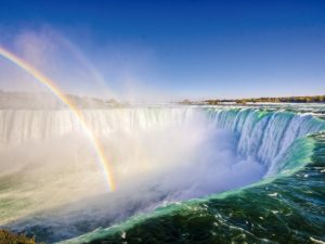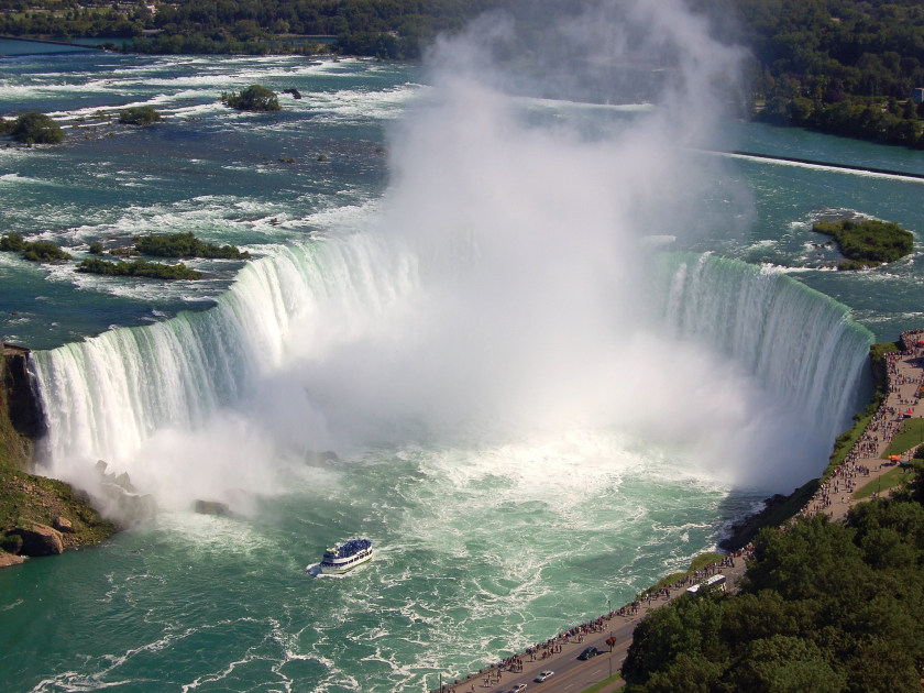 【尼加拉大瀑布】「尼加拉」在印第安語中意為「雷神之水」,印第安人認為瀑布的轟鳴是雷神說話的聲音。瀑布位於加拿大安大略省和美國紐約州的交界處,是世界第一大跨國瀑布。尼加拉瀑布源頭為尼加拉河,平均流量2,407立方米/秒,主瀑布位於加拿大境內,形似馬蹄,是瀑布的最佳觀賞地。尼加拉河的水流沖下懸崖至下游重新匯合,在不足2公里長的河段裡以每小時35.4公里的速度跌盪而下15.8米的落差,演繹出世界上最狂野的漩渦急流。可眺望「美國瀑布」、「馬蹄瀑布」及「新娘面紗瀑布」。稍後安排乘坐遊船,穿梭於波濤起伏的瀑布間。
