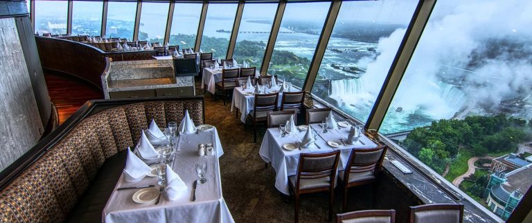 Skylon Tower旋轉餐廳,位於尼加拉瀑布上方775英尺,提供休閒精緻餐飲。餐廳每小時360度旋轉,夜晚可欣賞瀑布燈光、城市夜景和季節性煙火。