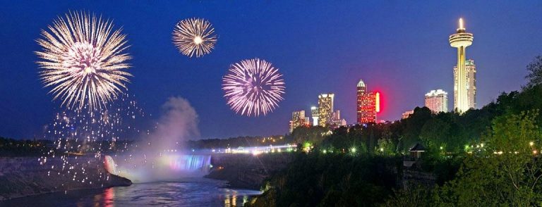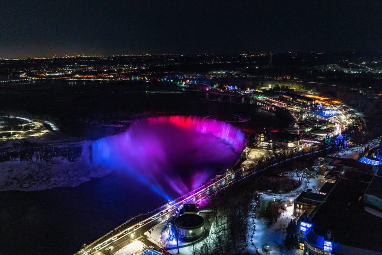 【Skylon Tower旋轉餐廳】除了可俯瞰美加兩側尼加拉瀑布的磅礡氣勢外,更是晚間欣賞瀑布燈光秀的絕佳場所。晚餐後客人可前往維多利亞女皇公園,觀賞尼亞加拉大瀑布燈光夜景,該景色有如彩虹劃過夜空,被譽為「黑夜的彩虹」。