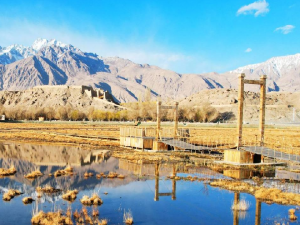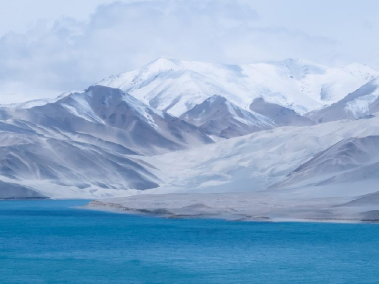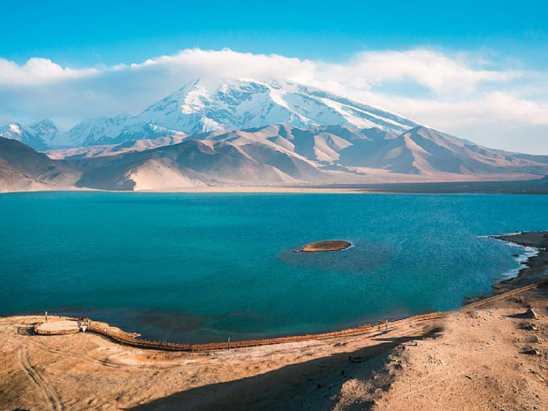 帕米爾高原:參觀布倫口湖頓、白沙山,海拔約3300米。這是以藍天白雲、雪山、湖泊與沙山形成的原生態畫卷,湖兩側遙遙矗立著公格爾九別峰,景色壯觀。《西遊記》中所描寫的流沙河就是這里。