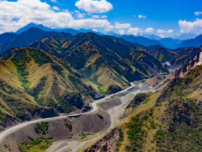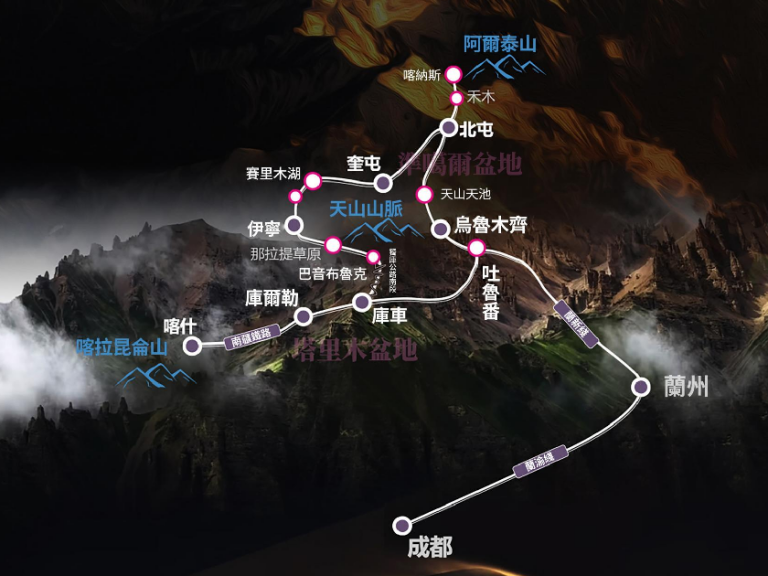 獨庫公路南段:天山大峽谷至巴音布魯克段,穿越路程約190公里。沿途可欣賞到大小龍池、天山雪山風光,在鐵力買提大阪打卡。